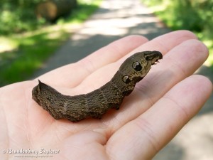 Auf dem Weg nach Lüchow entdecke ich Feldsteinkirchen und zwei beeindruckend große Raupen: Es handelt sich um die Raupe des Mittleren Weinschwärmers (Deilephila elpenor), die bei Gefahr den Kopf einzieht und ihre großen Augenflecken präsentiert um Feinde abzuschrecken. Als erwachsenes Tier wird sie ein hübscher olivgrün-rosafarbiger Nachtfalter. Rechts daneben eine Raupe des Weidenbohrers (Cossus cossus), die im Holz alter Weiden lebt. Beide Raupen werden rund 8 cm lang.